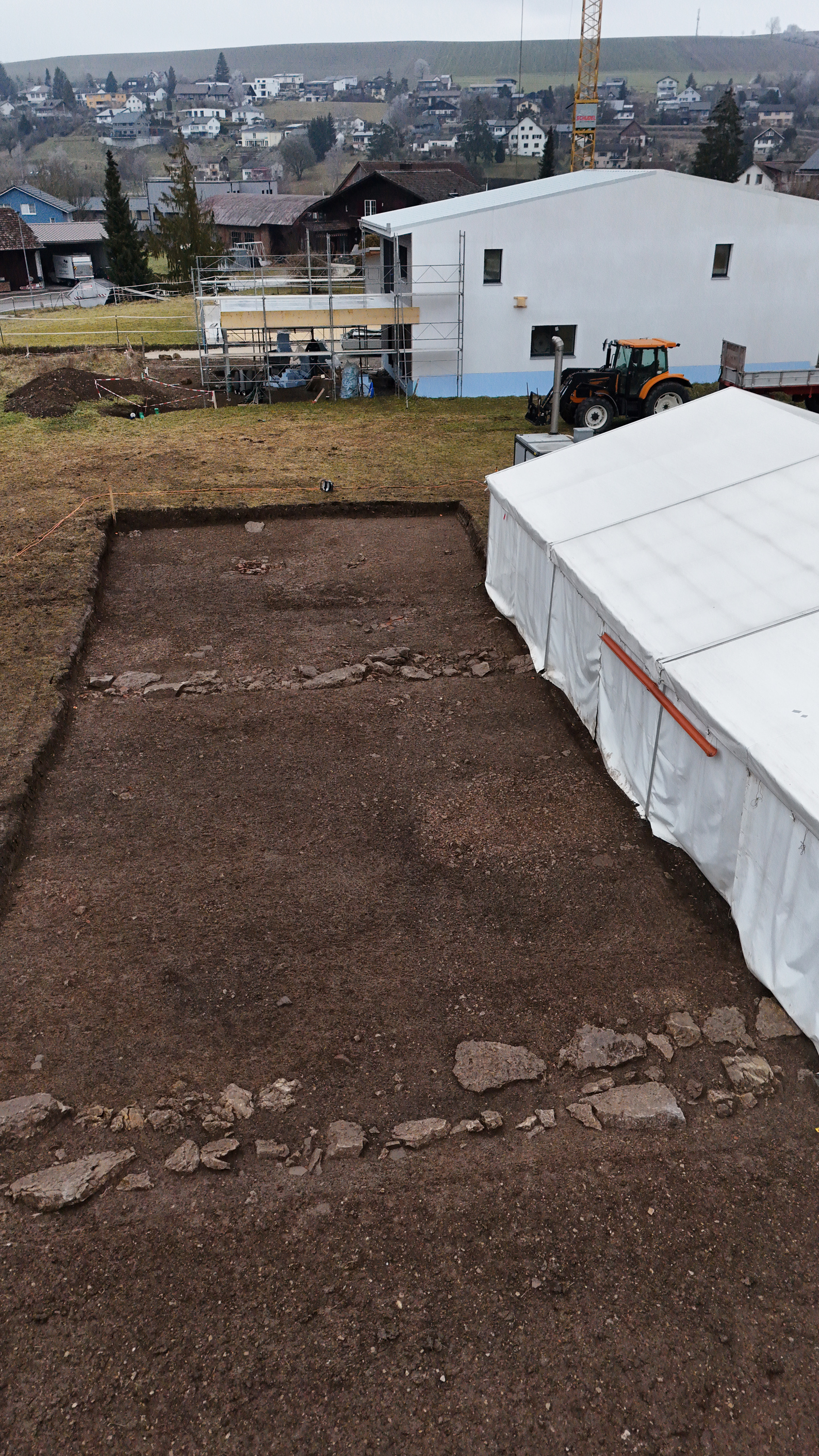 Bei den Ausgrabungen im Jahr 2024 wurden weitere Reste der ehemaligen Hauptstrasse durch die Siedlung sowie die Parzellen, die im Osten daran anschliessen, dokumentiert. Nur wenige Zentimeter unter dem Humus haben sich massive zweischalige Fundamentmauern, alte Bodenniveaus und Strassengräben erhalten. Steinfundamente von mindestens zwei Wohn- und Gewerbehäusern konnten bislang auf einer Länge von etwa 19 Metern gefasst werden. Es handelt sich um in typischer Streifenhausbauweise angelegte Bauten, die sich entlang der Strasse in Richtung Siedlungszentrum aneinanderreihten. Kompakte flächige Holzkohleschichten in der Nähe einer der Mauern sowie brandgerötete Steine könnten auf ein lokales Brandereignis hinweisen. Die Spuren deuten auf die Holzbauweise des Gebäudes hin.