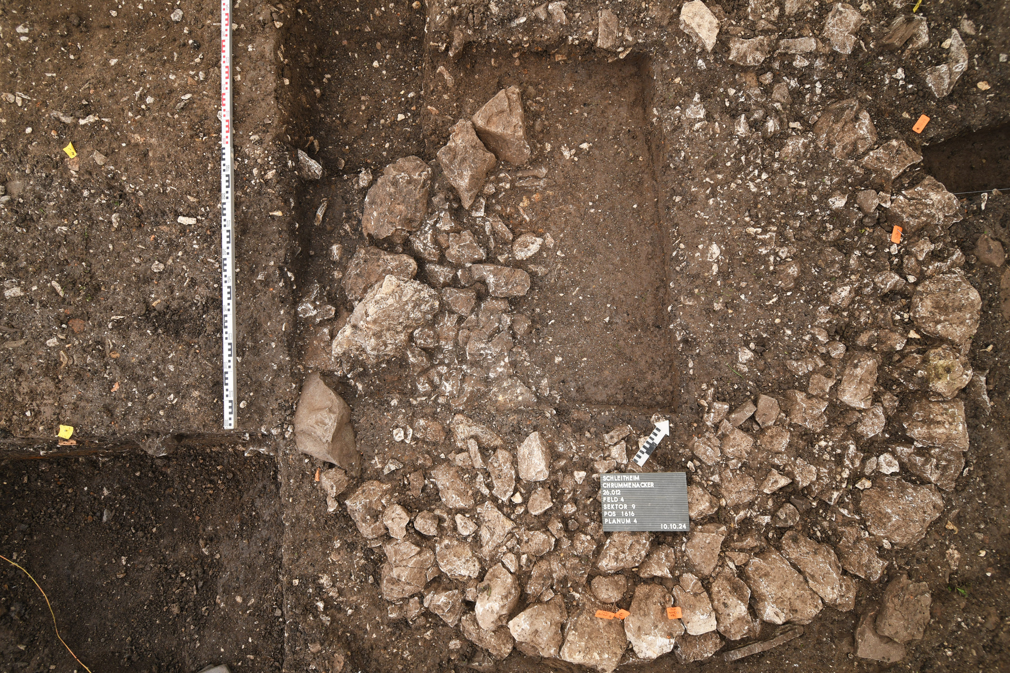 Im Bereich hinter den Häusern befinden sich Schuttplanien, Grabenstrukturen und zahlreiche Abfallgruben, die sowohl auf Gärten als auch auf handwerklich genutzte Flächen hinweisen. Tausende von Tonscherben, Schlacken, flächige Holzkohlereste und Tierknochen unterstreichen die intensiven Tätigkeiten in diesen Bereichen. Eine über sehr lange Zeit genutzte Werk- oder Vorratsgrube mit einem Durchmesser von rund zwei Metern und eine spätere, direkt daneben liegende runde Steinstruktur fast gleichen Ausmasses sind Zeugen der gewerblichen Nutzung dieser Areale. In der Grube wechseln sich massive Holzkohleschichten mit Schotter- und Sedimentschichten ab. Möglicherweise deutet dies unterschiedliche Nutzungsarten der Grube an. Während einer späteren Phase scheint die Oberfläche mit Buntsandsteinplatten ausgelegt gewesen zu sein. Typisch für die römische Zeit ist auch die Bestattung eines Säuglings im Siedlungsbereich, genauer gesagt im Hinterhof eines Hauses. Münzen, Melonenperlen in unterschiedlichen Blau- und Türkistönen, Fibeln, Nadeln, Überreste von Glasgefässen, zahlreiche verzierte Terra Sigillata-Fragmente, aber auch einfache Werkzeuge, die sich besonders gut in den Bereichen zwischen den Häusern erhalten haben, sind eindrückliche Zeugnisse der Lebensart der Bewohner*innen. Wie für die übrigen in Schleitheim lokalisierten Fundstellen postuliert, weist auch hier das Fundmaterial auf einen Siedlungsbeginn um 70 und eine kontinuierliche Nutzung bis ins 2. Jh. n. Chr. hin.