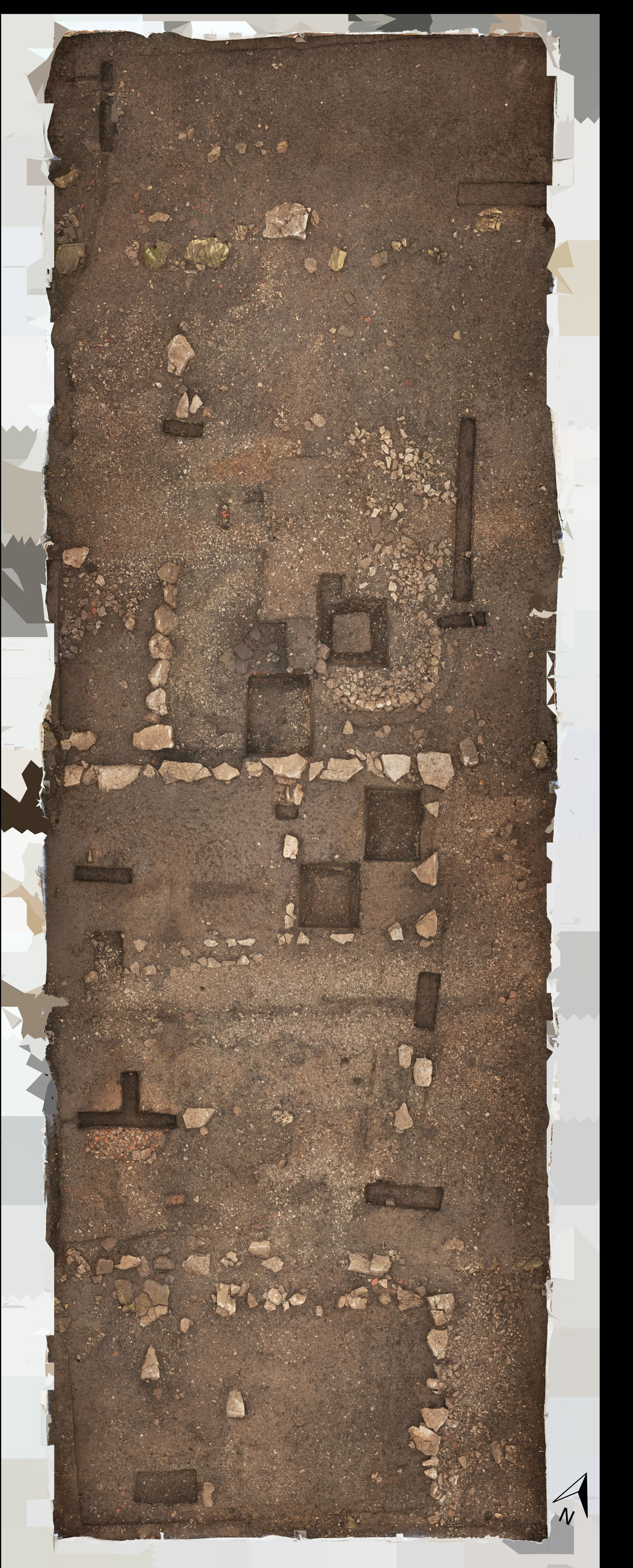 Die Laufniveaus sind entweder Stampflehmböden oder einfache Erd-/Schotterböden, die von Zeit zu Zeit erneuert wurden. Mindestens eine Binnenwand konnte gefasst werden, die eines der Häuser längs unterteilte. Insgesamt konnten vier Herdstellen im Bereich der Häuser dokumentiert werden. Unter den Fundamentsteinen, die teils über 70 cm tief in den Boden reichten, zeigt sich mindestens eine ältere Siedlungsphase durch dünne Lehmschichten an. Pfostenlöcher, Parzellenabgrenzungen durch einfache Sandsteinsetzungen und Schotterplanien werden bei der weiteren Auswertung zusätzliche Indizien für die Innenraumaufteilungen und die Nutzung von Aussen- wie auch Innenbereichen liefern.