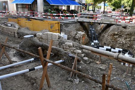 Während sich die jüngeren Bebauungsphasen anhand von historischen Stadtplänen aus dem 19. Jh. rekonstruieren lassen, erlaubten frühere Leitungsaufschlüsse eine Abschätzung der zu erwartenden Befunde. Durch die grossräumig geplante Öffnung der Strassenbereiche für Leitungsgräben und Hausanschlüsse können bereits bekannte Strukturen erneut ergänzt, vermessen und bei Bedarf neu beurteilt werden.