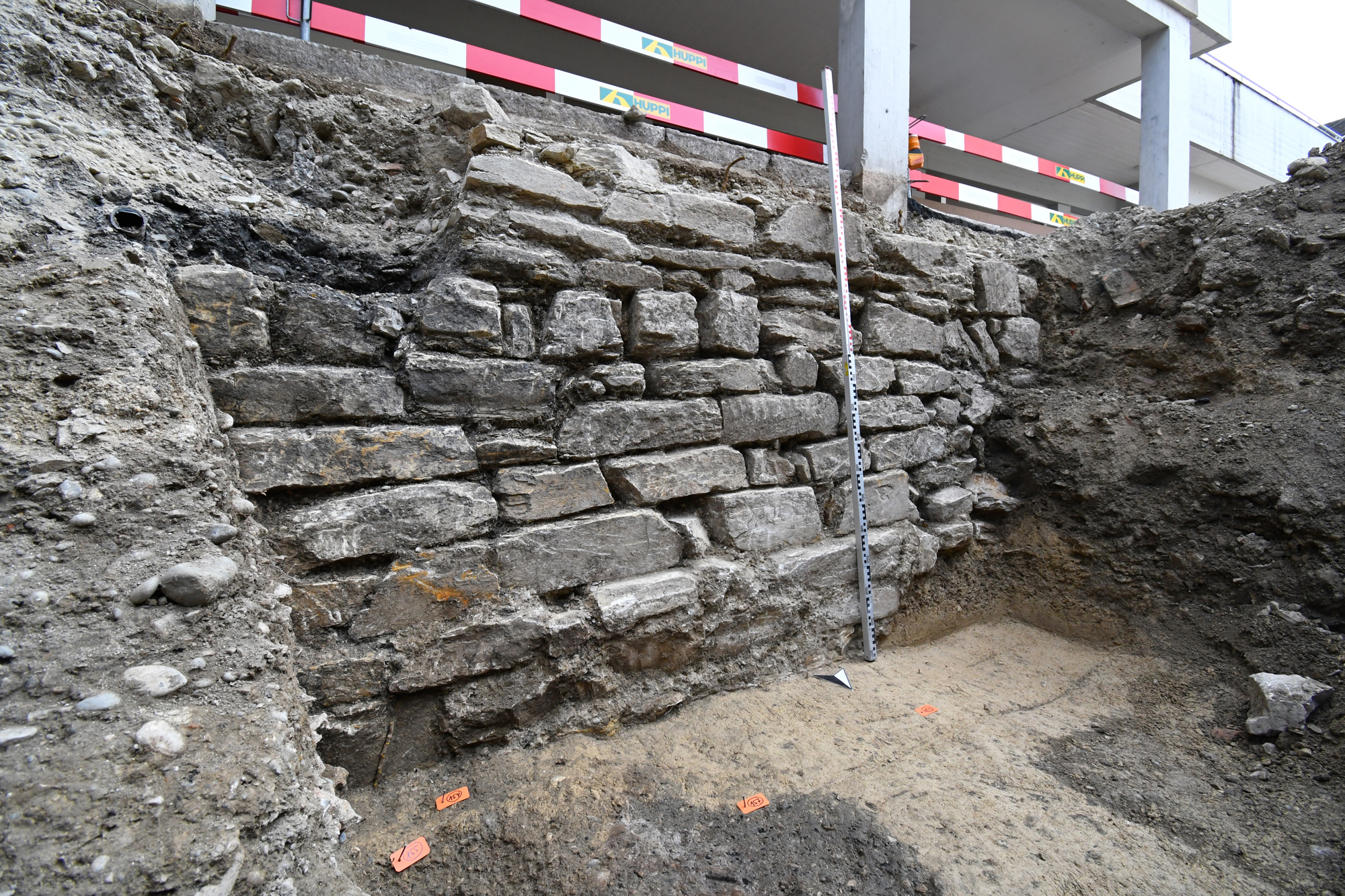 Bei den Untersuchungen im Bereich der Repfergasse konnten mehrere Befunde dokumentiert werden. Besonders hervorzuheben ist ein Abschnitt der Umfassungsmauer des ehemaligen Klosters St. Agnes, welche auf knapp 40 m Länge mit einzelnen Unterbrüchen verfolgt werden konnte (Abb. 2). Abgesehen davon wurde eine Mauer angetroffen, die an die Klostermauer anstösst und als Stadtmauer aus der Mitte des 15. Jahrhunderts erfasst wurde. Die Mauer war Teil der Stadtbefestigung von 1443–1445 und setzte sich auf der anderen Seite mit dem wenig später errichteten Pulverturm fort, von dem ebenfalls eine Ecke erfasst wurde. Nahe dieser Mauer wurden zudem drei neuzeitliche Gräber entdeckt (Abb. 3). Sie gehören zu einem Friedhof, welcher in der Mitte des 16. Jahrhunderts neu angelegt wurde. Sie könnten mit dem ins Kloster eingezogenen Spital oder dem nördlich davon liegenden Pestfriedhof in Zusammenhang stehen.