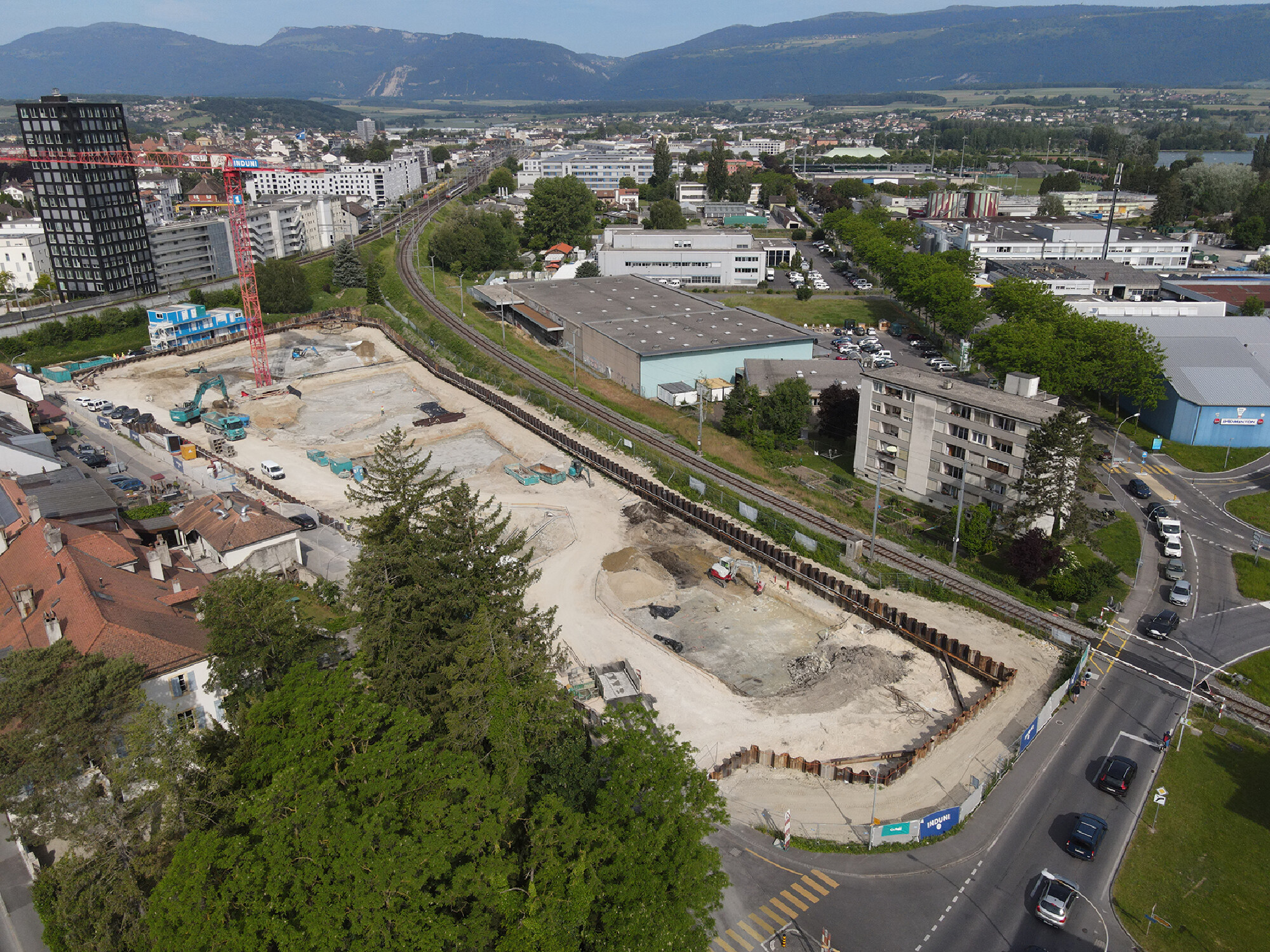 Fig. 1. Yverdon VD, Clendy-Dessous. Vue générale de l’emprise du chantier, en direction du nord-ouest. On distingue, au centre, la voie CFF Yverdon-Yvonand, au nord de celle-ci l’Avenue de Sports et, dans le coin supérieur droit, le lac de Neuchâtel.