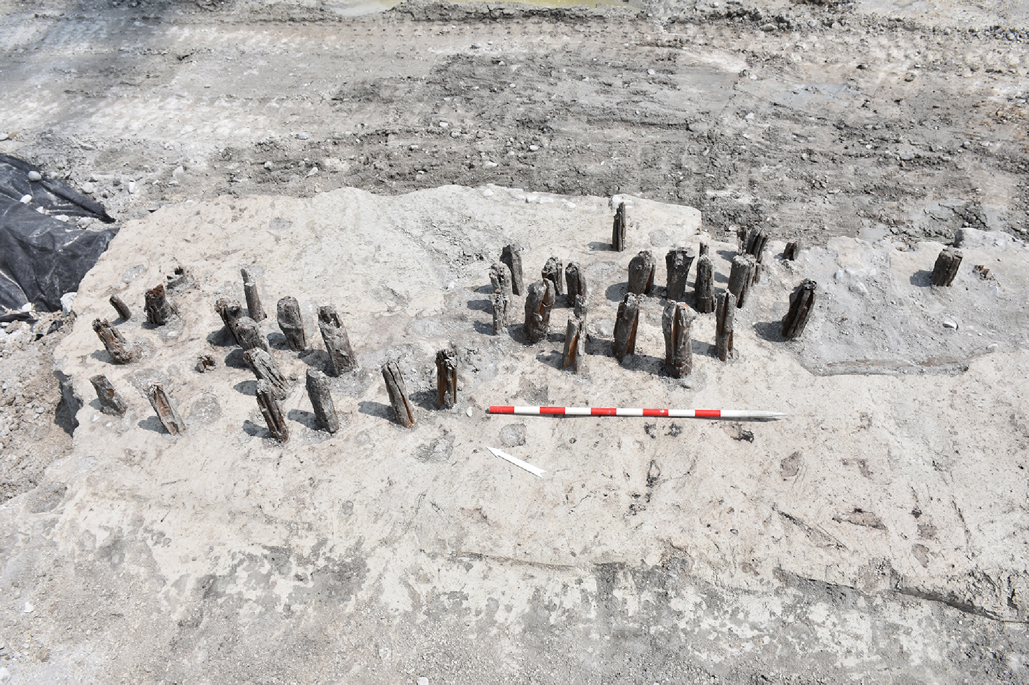 Pieux et trous de poteau dessinent au moins huit alignements NO-SE, clairement perceptibles dès la fouille. Ils se répartissent en deux groupes : l'un, plus à l'est, est orienté davantage NNO-SSE, tandis que l'autre, en limite ouest de l'emprise, est orienté ONO-ESE. Pour ce second groupe, nous disposons à ce stade de quatre datations radiocarbones, toutes situées entre 3955 et 3645 av. J.-C. après calibration à 2 sigma, et de deux datations dendrochronologiques fournissant des dates d'abattage en -3693/2 et -3687/6 pour deux pieux voisins.